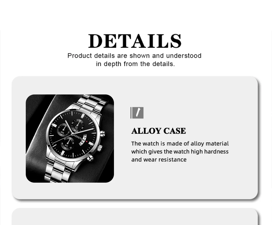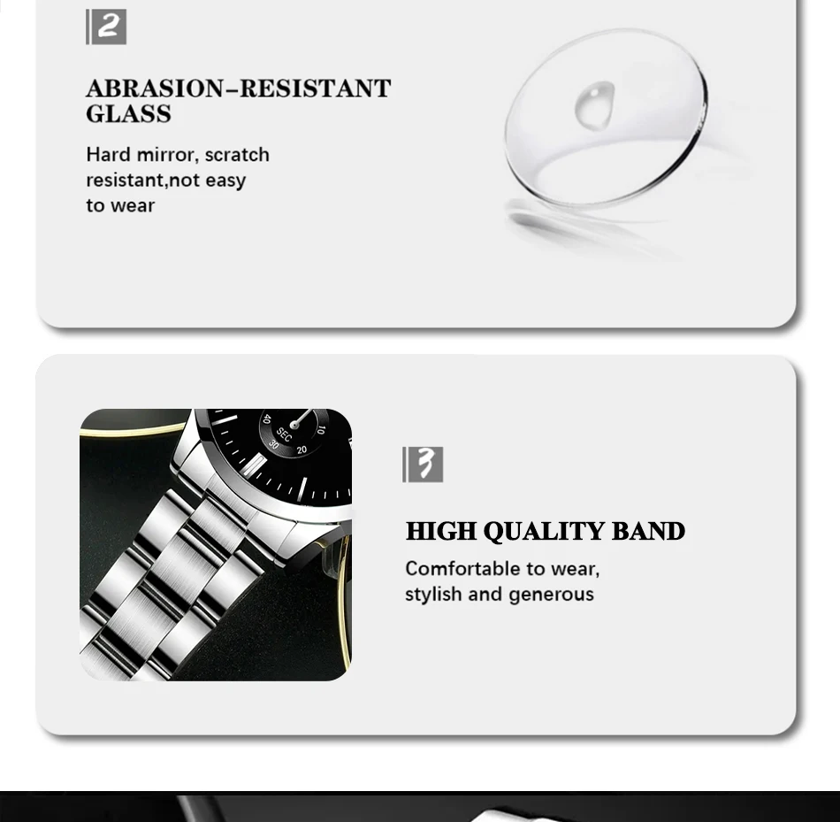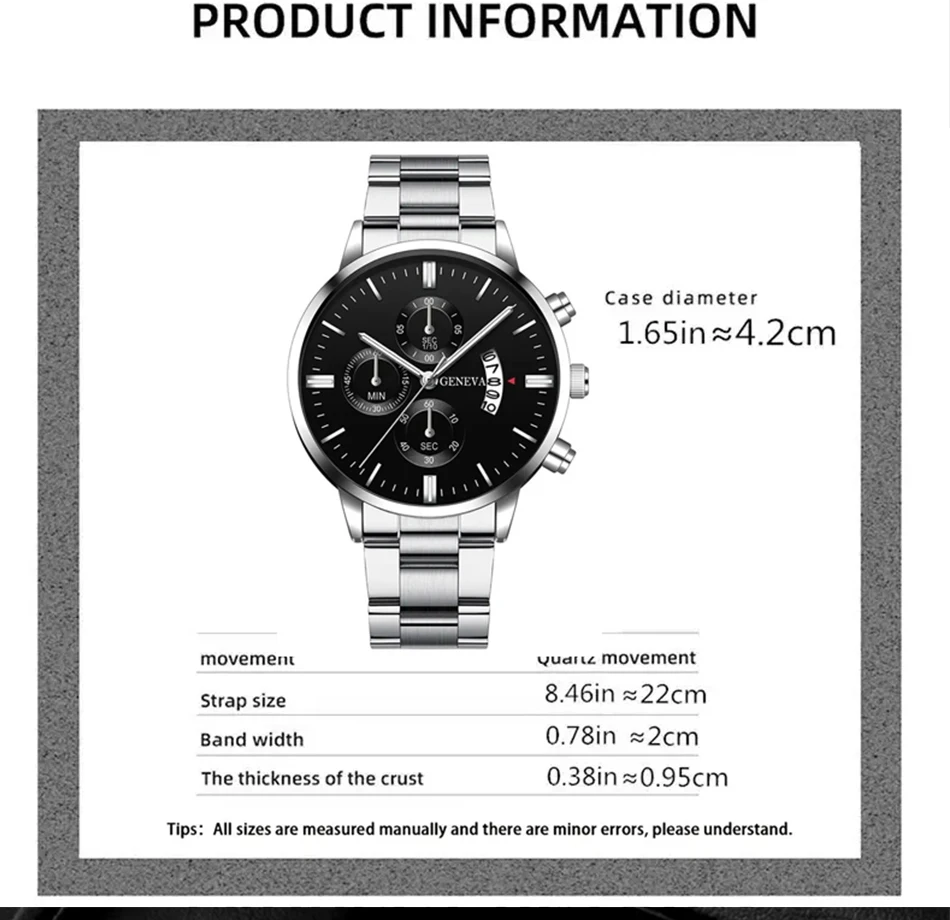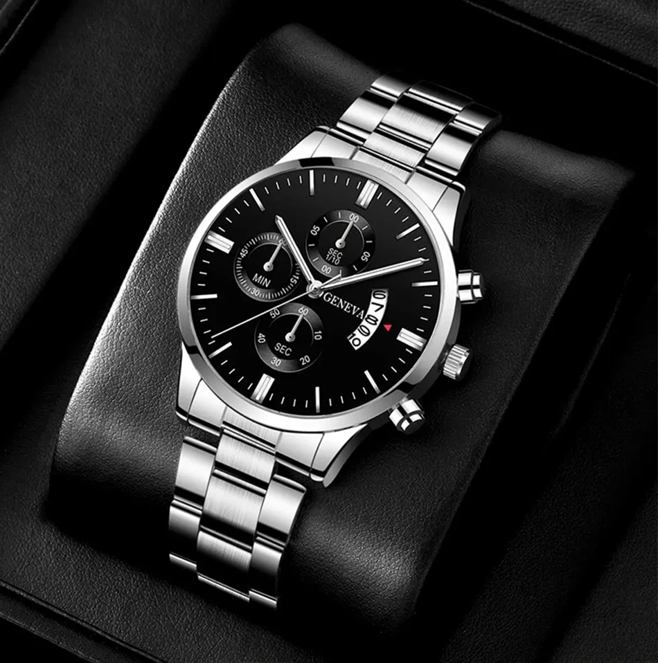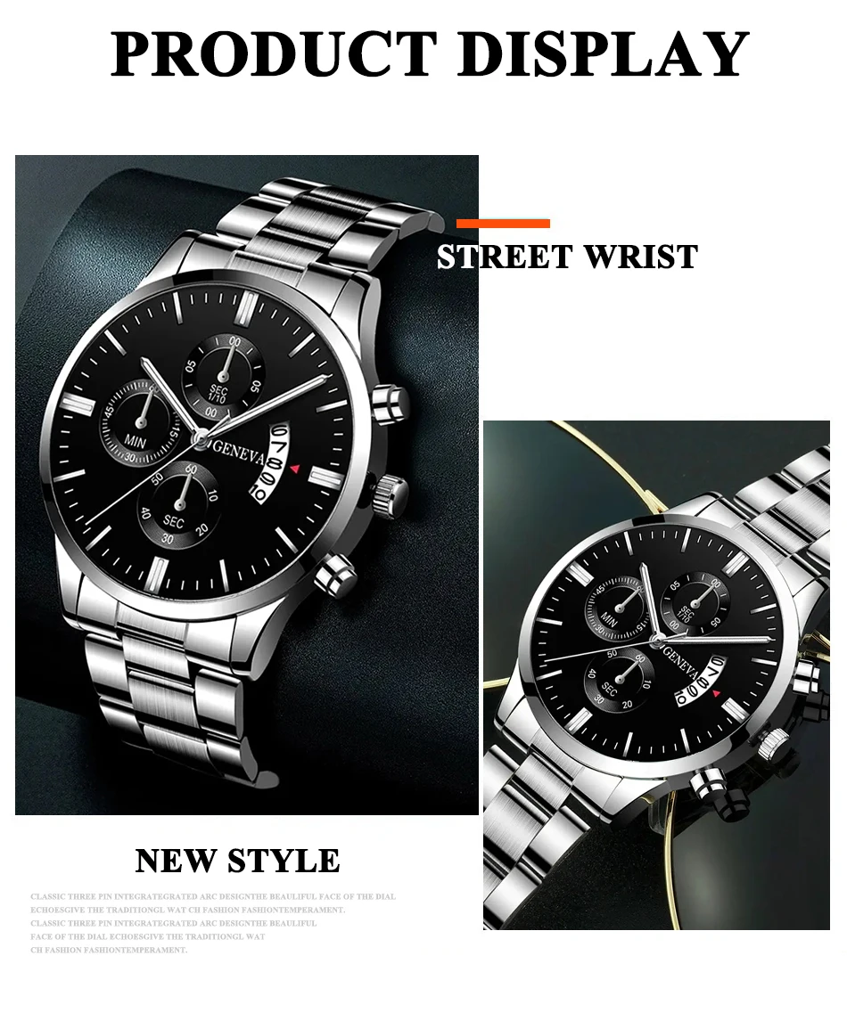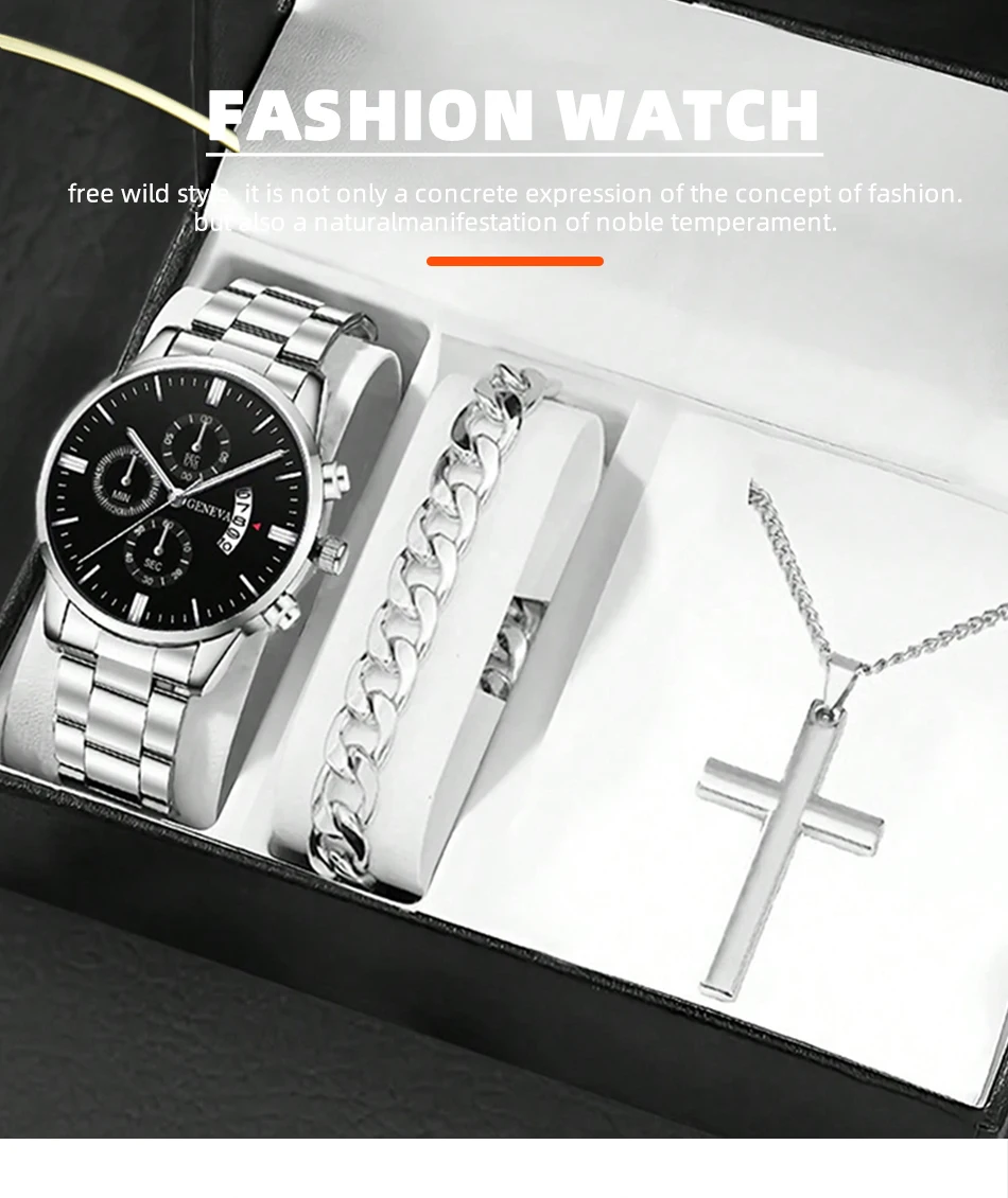 Um kit completo composto por 1 relógio masculino de aço inoxidável, 1 pulseira moderna e 1 colar elegante, ideal para quem gosta de um visual alinhado sem esforço.